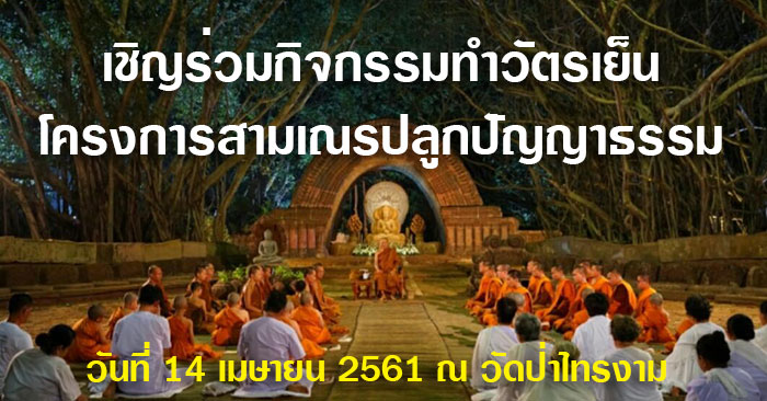 ขอเชิญพุทธศาสนิกชน จังหวัดอุบลราชธานี ร่วมกิจกรรมทำวัตรเย็น โครงการสามเณรปลูกปัญญาธรรม ณ วัดป่าไทรงาม วันที่ 14 เมษายน 2561 เวลา 17.30 น.-19.00 น. ณ วัดป่าไทรงาม อำเภอเดชอุดม จังหวัดอุบลราชธานี