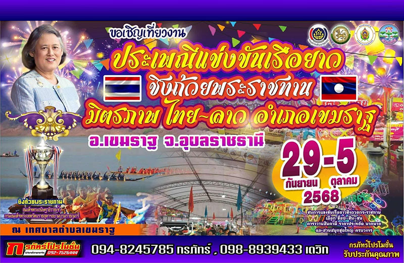 เทศบาลตำบลเขมราฐ อ.เขมราฐ จ.อุบลราชธานี จัดการแข่งขันเรือยาวประเพณีชิงถ้วยพระราชทานฯ มิตรภาพไทย-ลาว อำเภอเขมราฐ จังหวัดอุบลราชธานี ประเภท 12/30/40 ฝีพาย วันที่ 3-4-5 ตุลาคม 2568