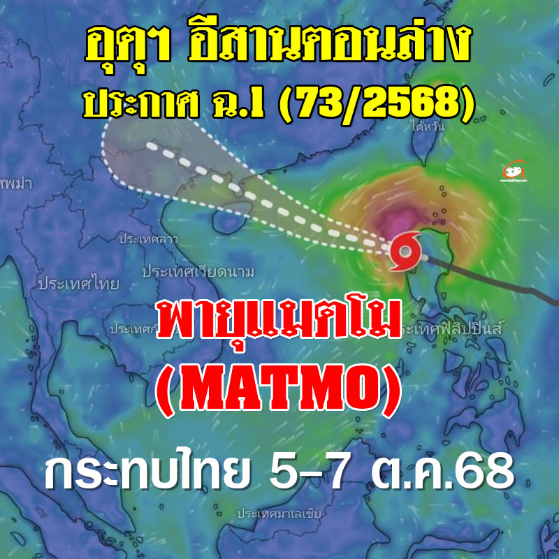 วันที่ 3 ตุลาคม พ.ศ. 2568 เวลา 17.30 น. ศูนย์อุตุนิยมวิทยาภาคตะวันออกเฉียงเหนือตอนล่าง ประกาศ ฉบับที่ 1 (73/2568) เรื่อง พายุ "แมตโม"