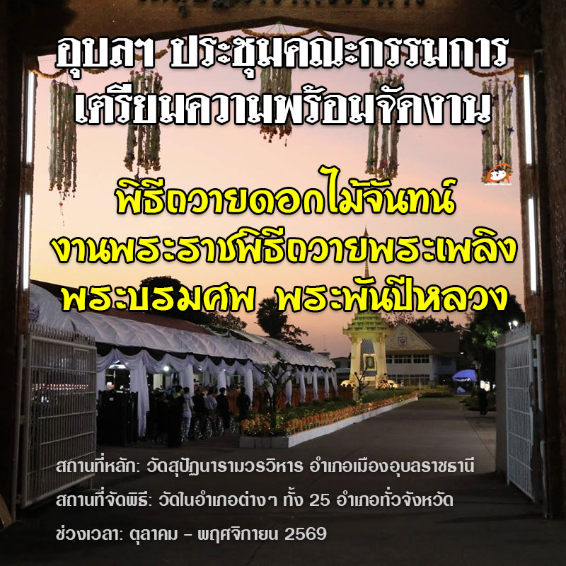 วันที่ 5 มีนาคม 2569 เวลา 13.30 น. นายณรงค์ เทพเสนา ผู้ว่าราชการจังหวัดอุบลราชธานี เป็นประธานการประชุมคณะกรรมการอำนวยการจัดงานพิธีถวายดอกไม้จันทน์ จังหวัดอุบลราชธานี เพื่อเป็นการเตรียมงานพระราชพิธีถวายพระเพลิงพระบรมศพ สมเด็จพระนางเจ้าสิริกิติ์ พระบรมราชินีนาถ พระบรมราชชนนีพันปีหลวง และเตรียมความพร้อมในการจัดพิธีถวายดอกไม้จันทน์ของประชาชนในส่วนภูมิภาค อีกทั้งเพื่อให้การจัดพิธีถวายดอกไม้จันทน์ของประชาชนในจังหวัด เป็นไปด้วยความเรียบร้อยงดงาม และสมพระเกียรติทุกประการ โดยมีประธานฝ่ายสงฆ์ และรองผู้ว่าราชการจังหวัดอุบลราชธานี หัวหน้าส่วนราชการ นายอำเภอ หน่วยงานรัฐวิสาหกิจ ภาคเอกชน เข้าร่วมประชุม ณ ห้องประชุมพรหมวรราช ชั้น 4 ศาลากลางจังหวัดอุบลราชธานี
