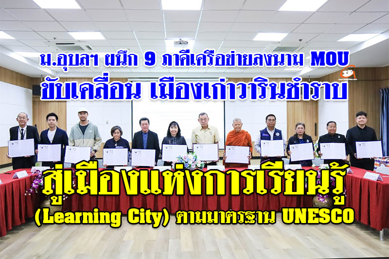 มหาวิทยาลัยอุบลราชธานี โดยคณะวิศวกรรมศาสตร์ ร่วมกับภาคีเครือข่าย 9 หน่วยงาน ยกระดับ "เมืองเก่าวารินชำราบ" ให้กลายเป็นพื้นที่แห่งการเรียนรู้ที่ยั่งยืน โดยใช้องค์ความรู้และนวัตกรรมบูรณาการงานวิจัยและเทคโนโลยีสมัยใหม่มาใช้ถ่ายทอดมรดกทางวัฒนธรรมและภูมิปัญญาท้องถิ่นให้เข้าถึงคนทุกกลุ่ม พร้อมผลักดันให้เมืองวารินชำราบก้าวสู่การเป็น "เมืองแห่งการเรียนรู้ (Learning City)" ที่ได้รับการรับรองจาก UNESCO อย่างเป็นรูปธรรม โดยมี รองศาสตราจารย์ ดร.ชุตินันท์ ประสิทธิ์ภูริปรีชา อธิการบดี เป็นประธานในพิธี พร้อมลงนาม และผู้ช่วยศาสตราจารย์ ดร.มงคล ปุษยตานนท์ คณบดีคณะวิศวกรรมศาสตร์ กล่าวรายงาน พร้อมหารือแผนพัฒนาความร่วมมือและแลกเปลี่ยนแนวทางการทำงานร่วมกัน ณ ห้องประชุม 6601 อาคาร EN6 คณะวิศวกรรมศาสตร์ เมื่อวันที่ 18 มีนาคม 2569 ที่ผ่านมา