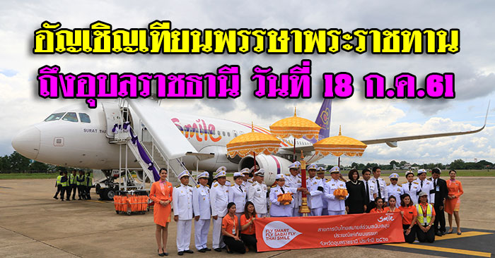 ขอเชิญชวนชาวอุบลราชธานี ร่วมพิธีอัญเชิญเทียนพรรษาพระราชทาน ซึ่งจะถึงจังหวัดอุบลราชธานี โดยสายการบินไทยสมายล์ เที่ยวบินที่ WE024 วันที่ 18 กรกฎาคม 2561 เวลา 13.35 น.