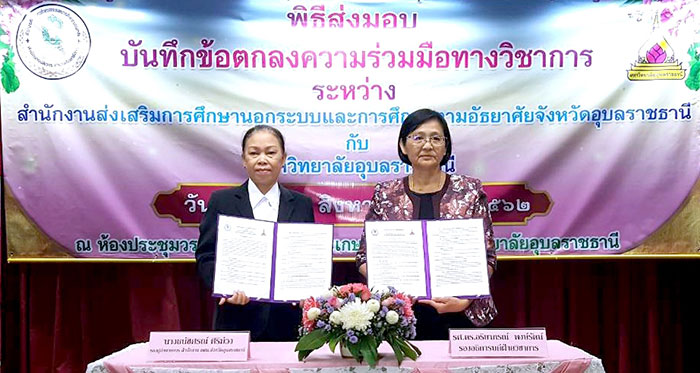 ทางคณะเกษตรศาสตร์จึงได้จัดทำบันทึกข้อตกลงความร่วมมือทางวิชาการ ระหว่างสำนักงานการศึกษานอกระบบและการศึกษาตามอัธยาศัยจังหวัดอุบลราชธานีกับมหาวิทยาลัยอุบลราชธานี โดยมี ผู้ช่วยศาสตราจารย์ ดร.ชุตินันท์ ประสิทธิ์ภูริปรีชา อธิการบดีมหาวิทยาลัยอุบลราชธานี เป็นตัวแทนมหาวิทยาลัยอุบลราชธานี ลงนามร่วมกับ นายธฤติ ประสานสอน ผู้อำนวยการสำนักงานส่งเสริมการศึกษานอกระบบและการศึกษาตามอัธยาศัยจังหวัดอุบลราชธานี เป็นตัวแทนสำนักงานส่งเสริมการศึกษานอกระบบและการศึกษาตามอัธยาศัยจังหวัดอุบลราชธานี ลงนามบันทึกข้อตกลงความร่วมมือทางวิชาการ