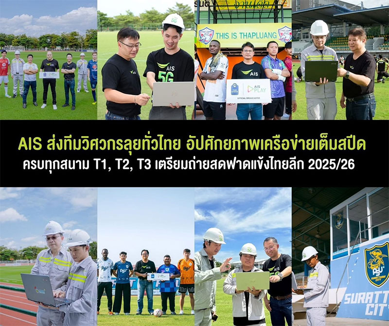 AIS พร้อมระเบิดความมันส์! ศึกฟุตบอลไทยลีก 2025/26 ผ่าน AIS PLAY ตลอดฤดูกาล ครบทุกลีก ไทยลีก 1, ไทยลีก 2, ไทยลีก 3, ฟุตบอลถ้วย เอฟเอ คัพ และฟุตบอลถ้วย ลีก คัพ รวมถึงฟุตบอลลีกเยาวชน U-21, ฟุตบอลหญิงลีก 1 และ 2 คมชัดทุกสนาม ให้แฟนบอลทุกเครือข่าย รับชมฟรีครบทุกลีกตลอดฤดูกาล นำทีมวิศวกรเครือข่ายลงพื้นที่ เสริมกำลังโครงข่าย 5G, ไฟเบอร์ออฟติก รองรับการถ่ายทอดสดจากขอบสนามถึงหน้าจอแฟนบอลทั่วประเทศ เสิร์ฟภาพคมชัด เสียงกระหึ่ม พร้อมไฮไลต์ รีรัน และคอนเทนต์สุดมันส์ตลอดฤดูกาล เพื่อให้แฟนบอลไม่พลาดทุกจังหวะสำคัญ