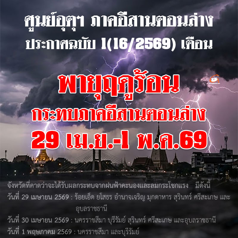 ในช่วงวันที่ 29 เม.ย. - 1 พ.ค. 69 ภาคตะวันออกเฉียงเหนือตอนล่างจะมีพายุฤดูร้อนเกิดขึ้น โดยมี